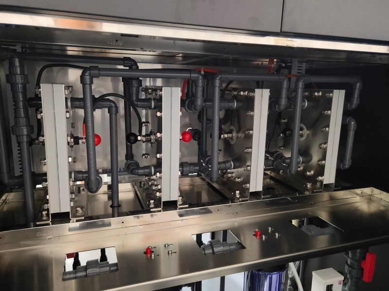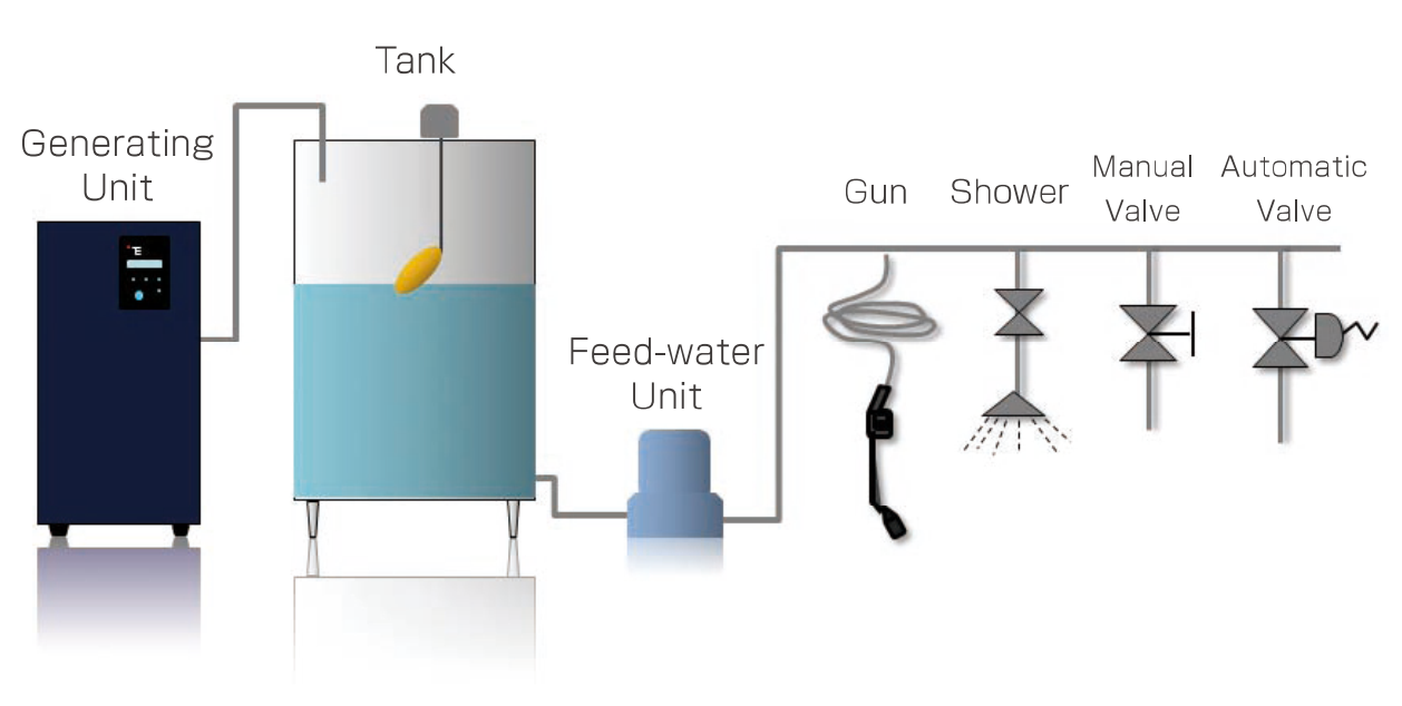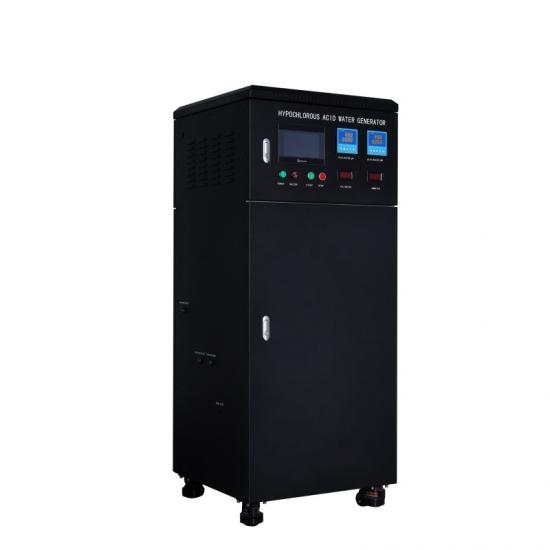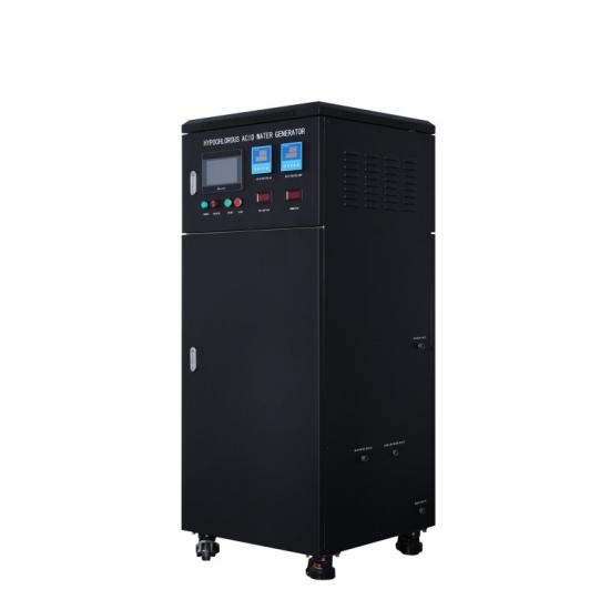 Der Generator für hypochlorige Säure ist ein System, das Leitungswasser durch Elektrolyse in einem Wasseraufbereitungssystem erzeugt und von einer speziellen Elektrolysezelle betrieben wird. Das System produziert hypochlorige Säure (HCLO) mit einem pH-Wert von 5 bis 6,5, einem Redoxpotential von +750 mV oder mehr und verfügbarem Chlor von 50 bis 60 mg/l. Außerdem produziert es Natriumhydroxid (NaOH) mit einem pH-Wert von 10 bis 12 und einem Redoxpotential von -800 bis 900 mV.