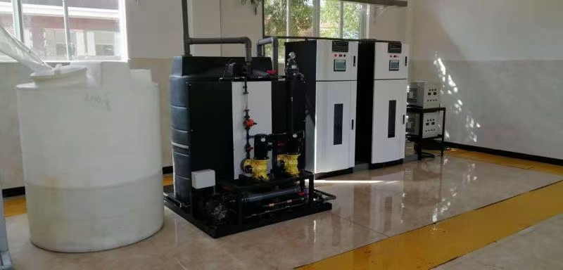 Nach der Filterung des Wassers wird eine Chlorierung durchgeführt, um verbleibende Parasiten, Bakterien und Viren abzutöten und das Wasser vor Keimen zu schützen, wenn es in Haushalte und Unternehmen geleitet wird. Der Natriumhypochloritgenerator ist ein Desinfektionsgerät zur Wasseraufbereitung, das Salz als Rohstoff verwendet und durch eine elektrolytische Reaktion eine Natriumhypochloritlösung erzeugt.