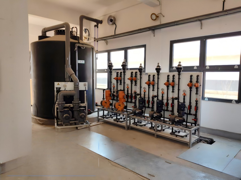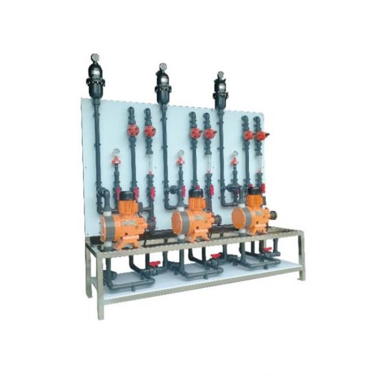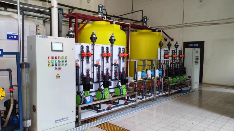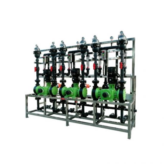 Das System besteht aus einem präzisen Dosierkontrollsystem, Dosierpumpen, den zugehörigen Ventilen und chemischen Rohrleitungen usw. Das Dosiersystem verfügt über eine auf einem Schlitten montierte Struktur und das Material der auf dem Schlitten montierten Halterung kann aus Edelstahl, Aluminiumlegierung usw. ausgewählt werden.
