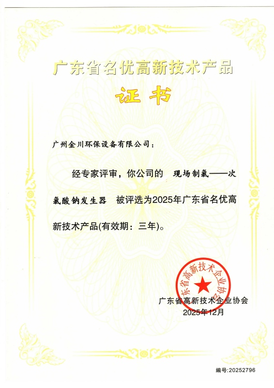 It is particularly encouraging that the "On-site Sodium Hypochlorite Generator" independently developed by Jinchuan has been honored with this distinction, making it the only manufacturer of sodium hypochlorite generator in Guangdong Province in 2025 to receive this recognition. This not only represents a high affirmation of Jinchuan's technical capabilities but also serves as a strong testament to our sustained leadership in the field of water treatment and disinfection.